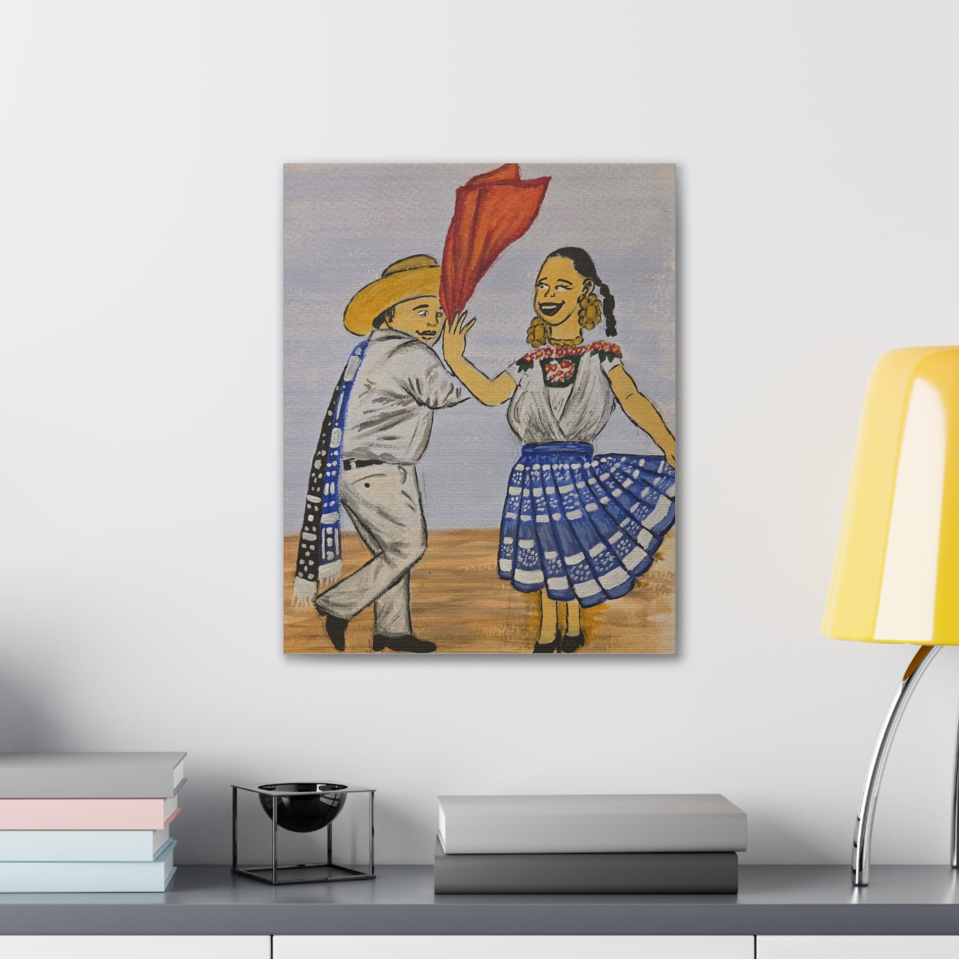 This stretched canvas brings a slice of lively folk tradition into your home. The painted scene—two dancers mid-step, the man waving a bright red cloth and the woman in a patterned blue skirt—captures motion, music, and a warm, sunlit floor that suggests a village square. The textured polyester surface holds saturated, crisp color so the reds and blues pop from across the room. Lightweight pine stretcher bars keep the image taut and gallery-ready right out of the box. Hang it vertically or horizontally; it arrives assembled with mounting hardware and a subtle QR code on the back for care or provenance details. There’s a handcrafted, everyday joy to this piece that fits a kitchen wall, a hallway, or a cozy living room where stories and gatherings happen.